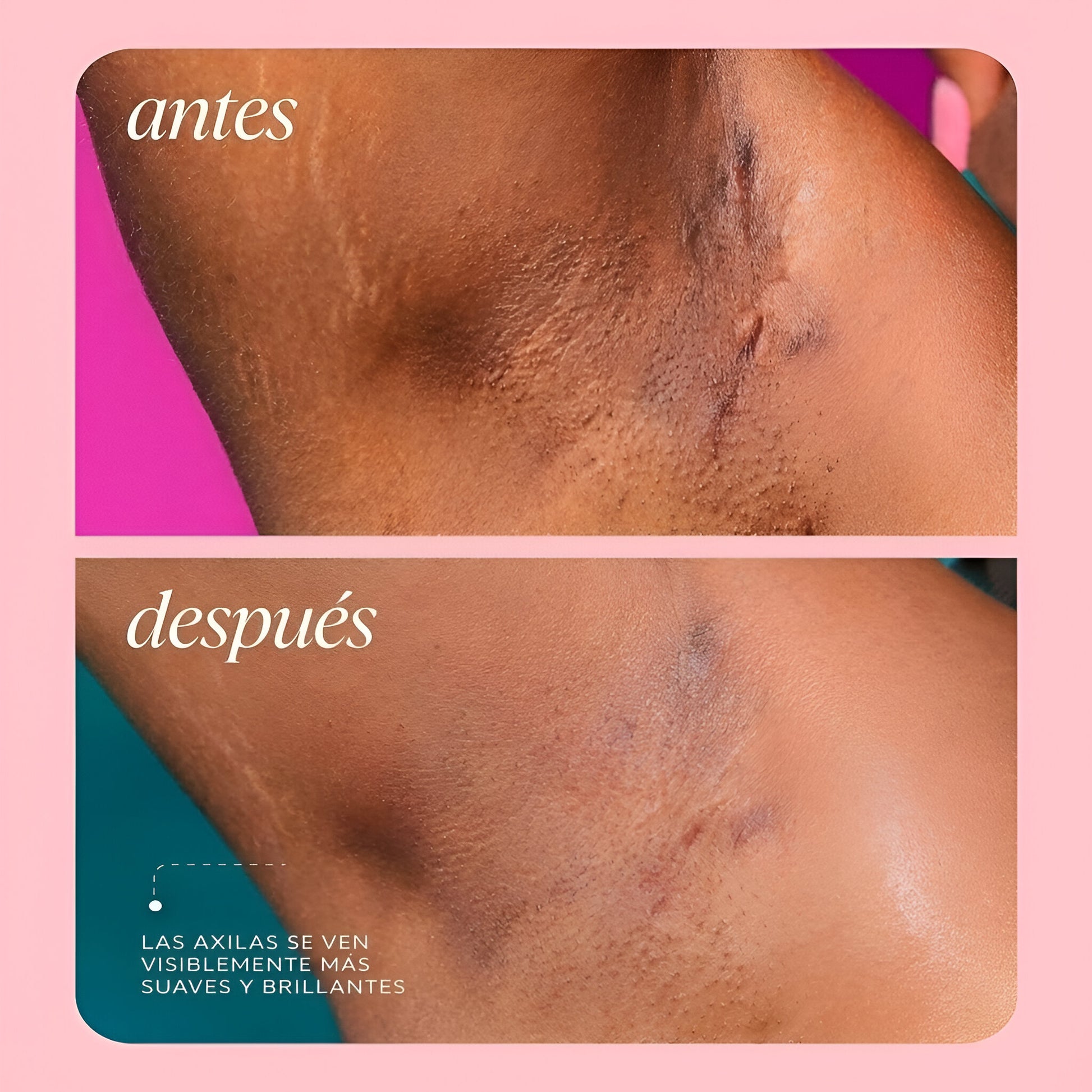 - Reduce visiblemente las manchas oscuras en axilas, zona íntima, rodillas, cuello y otras áreas.